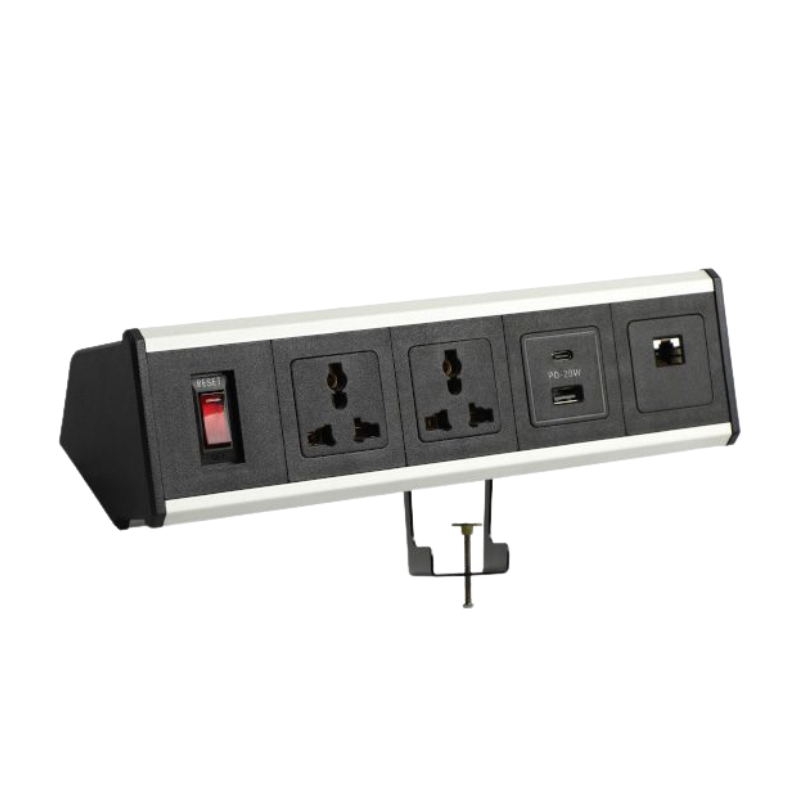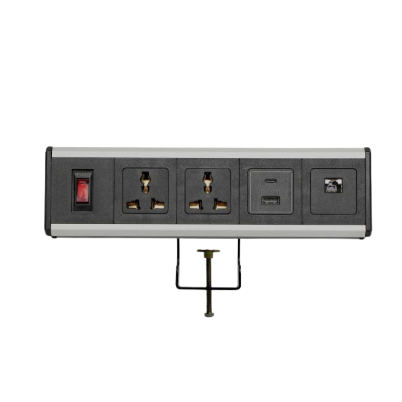 Power dock can be clamped onto the edge of any desk and is easily relocatable for changing work environments
