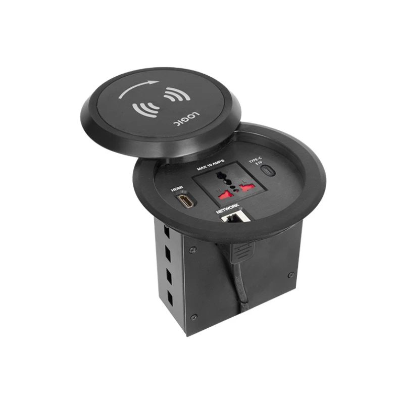 Available with a slide open cover system, this compact cable manager allows us to get a smooth presentation by connecting audio visual equipment.